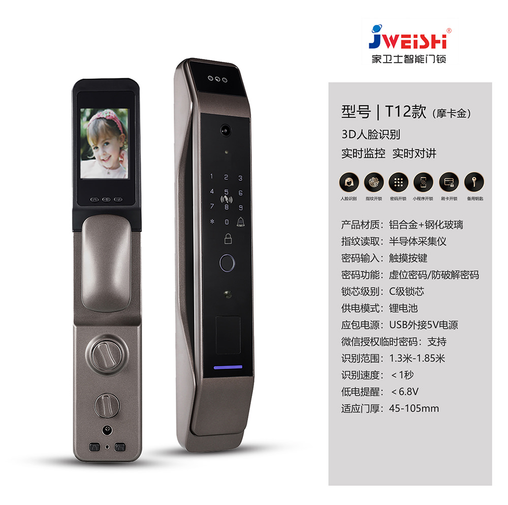 - 视频对讲、猫眼、防撬报警、虚位密码防窥视、延时自动上锁、逗留抓拍、主动监控、低电量报警、AI语音提示、支持多国语言