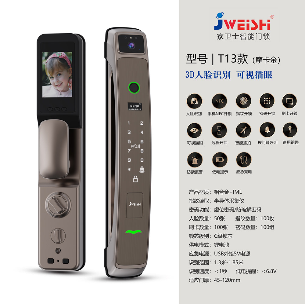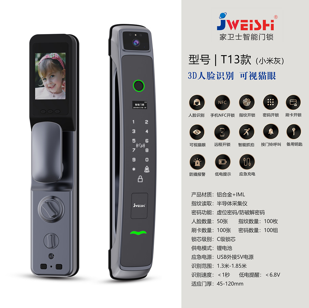 - 猫眼、防撬报警、虚位密码防窥视、延时自动上锁、逗留抓拍、主动监控、低电量报警、AI语音提示、支持多国语言