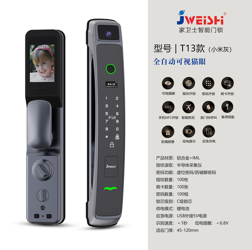 - 猫眼、防撬报警、虚位密码防窥视、延时自动上锁、逗留抓拍、主动监控、低电量报警、AI语音提示、支持多国语言