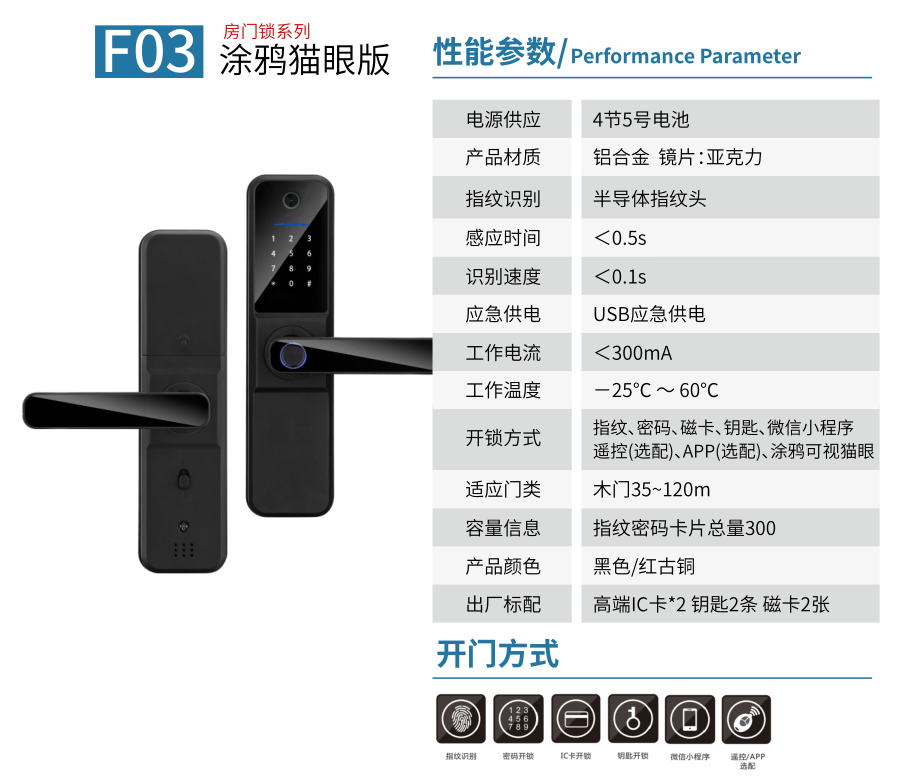 - 防撬报警、虚位密码防窥视、试错报警、低电量报警、AI语音提示、支持多国语言、应急充电、3.5寸高清显示屏 (选配)