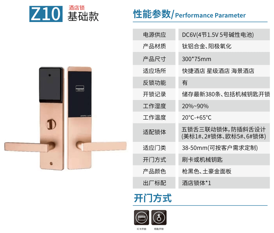 - 开锁方式:刷卡、机械钥匙、TTHOTEL APP、TTLOCK APP